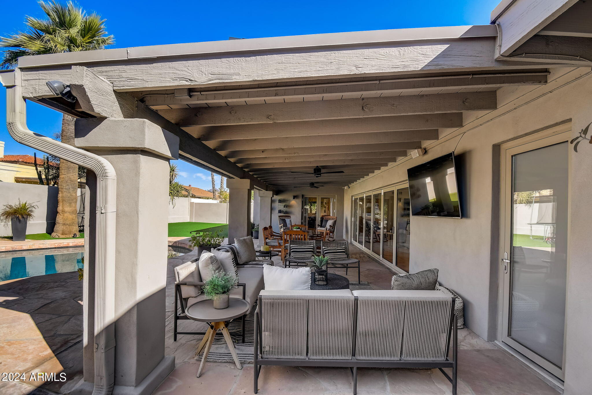 This property is something special, with 5 bedrooms and 3 bathrooms on an oversized lot, (see MORE) remodeled to fit today's needs. Enter to a jaw-dropping family room, with ceilings raised and the kitchen wall removed to connect the spaces, creating a stunning great room. With wood floors, floor to ceiling stacked stone fireplace and kitchen accents, and AMAZING full-wall retractable doors, creating the epitome of indoor-outdoor living. The floor plan is well-split, with two large guest bedrooms and a guest bathroom in the west wing, and an east wing with an additional two guest bedrooms and guest bathroom, along with the oversized primary suite, with an impressive closet, and direct patio access. Speaking of, you'll love this back yard! With a HUGE covered patio, BBQ area, chiminea for those chilly nights, plenty of turf space for Fido or football, and of course the heated pool.